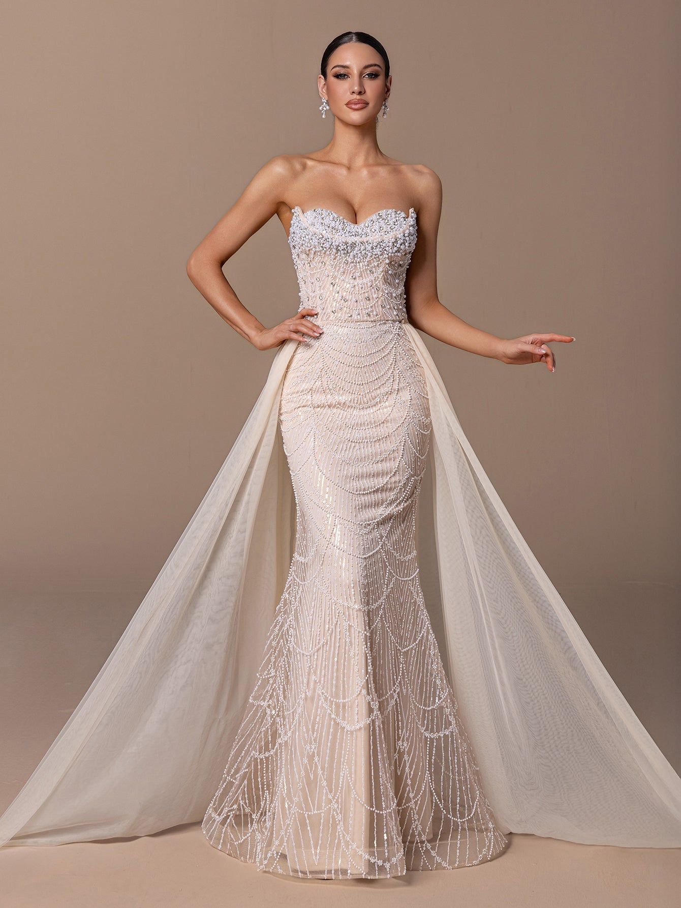Strapless Beaded Sequin Mermaid Gown with Tulle Overlay & Pearl Accents