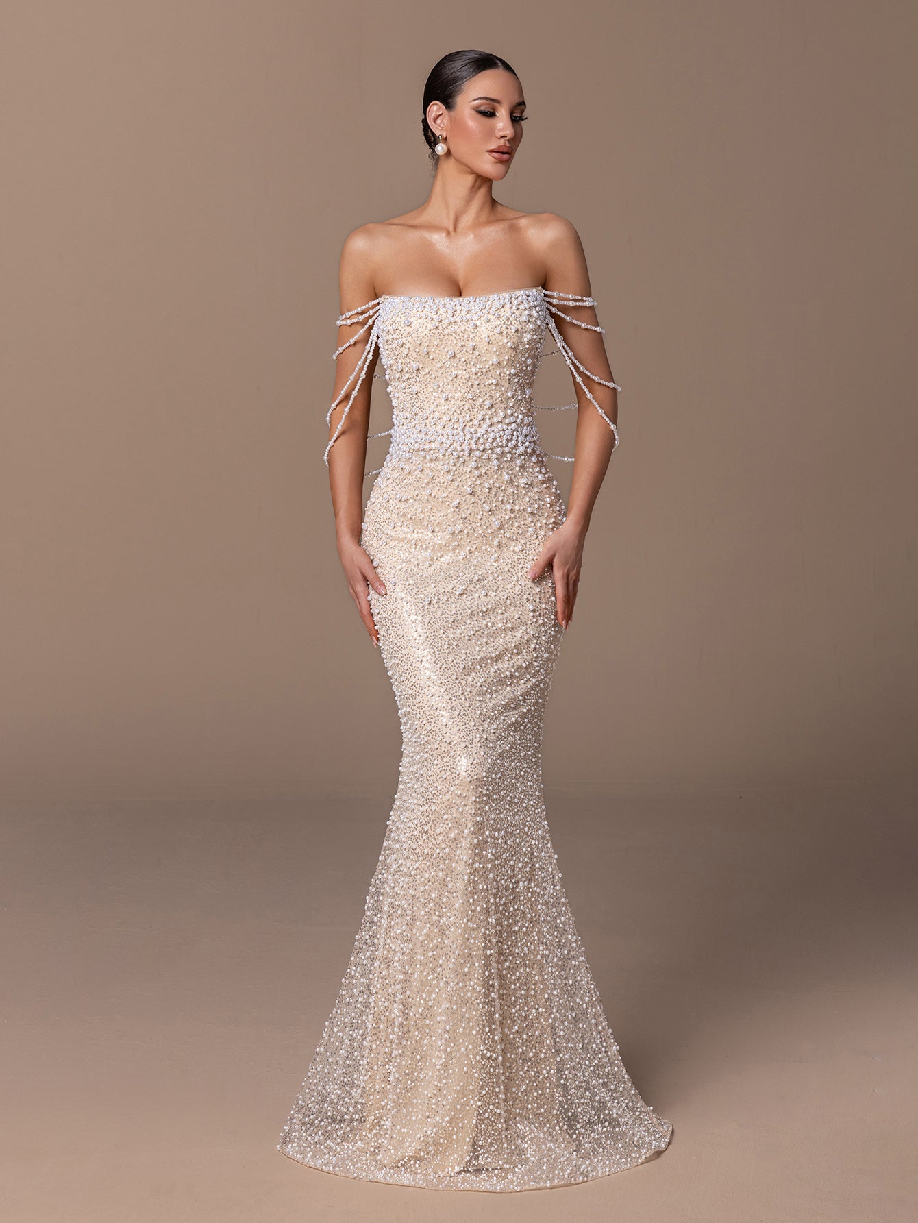 Strapless Mermaid Gown with Beaded Strands Draping Shoulders & Sequin Accents