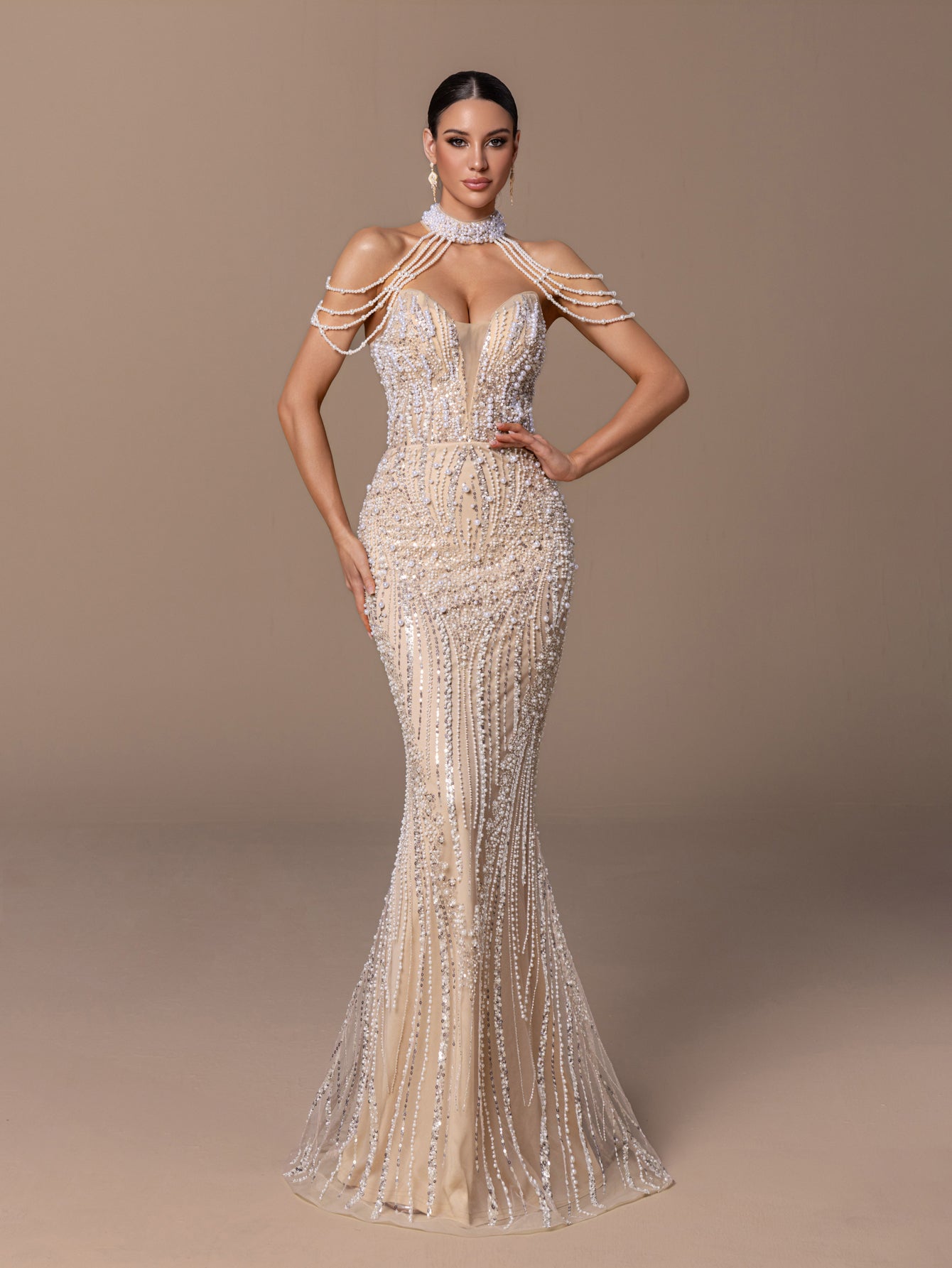 Strapless Mermaid Gown with Beaded Collar, Shoulder Chains & Sequins