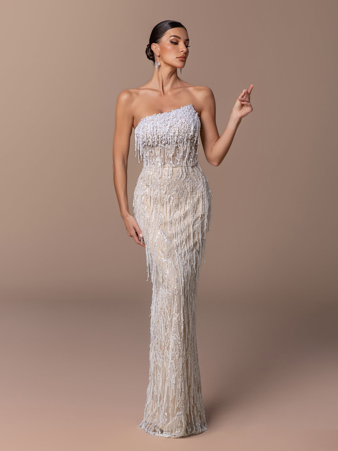 Strapless Mermaid Gown with Beaded Sequins, Tassels & Back Slit