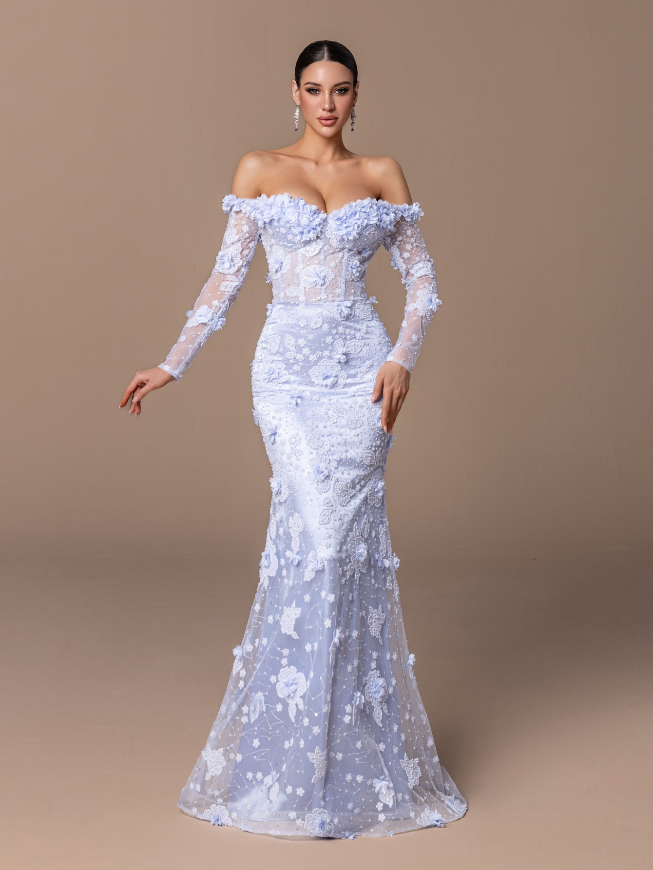 Off-Shoulder Mermaid Gown with Corset,Floral Applique & Beaded Accents