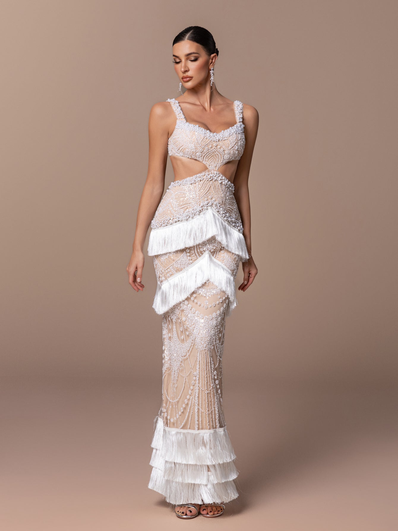 Spaghetti Strap Mermaid Gown with Beaded Embroidery, Multi-Layered Tassels & Waist Cut Out
