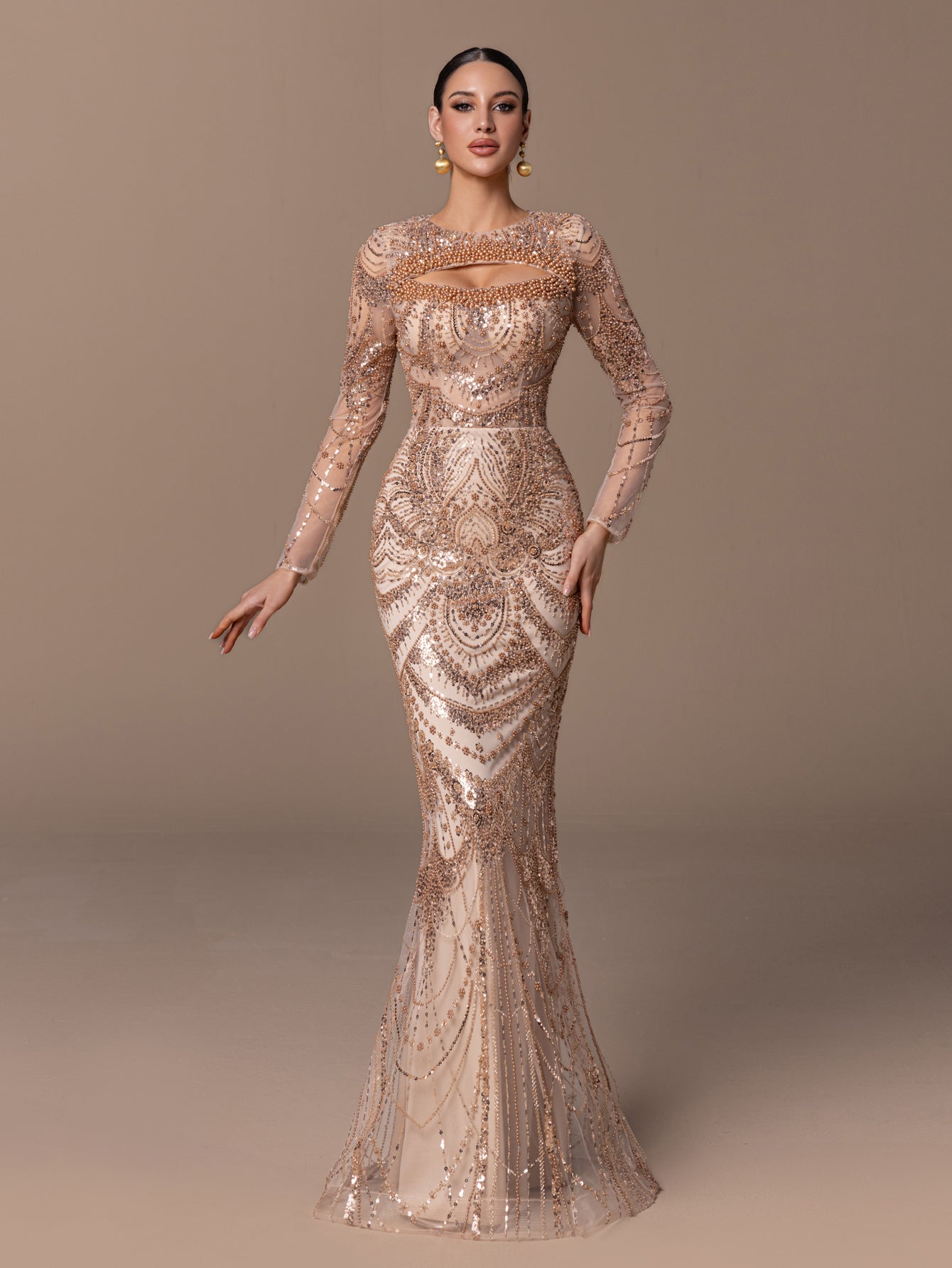 Mermaid Gown with Long Sleeves, Beaded Sequins & Geometric Patterns