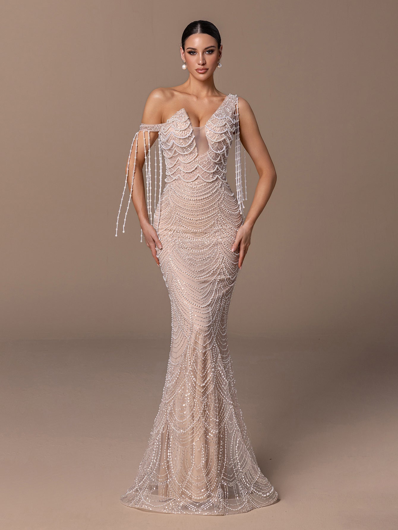 Sequin One-Shoulder Mermaid Gown with Beaded Tassels
