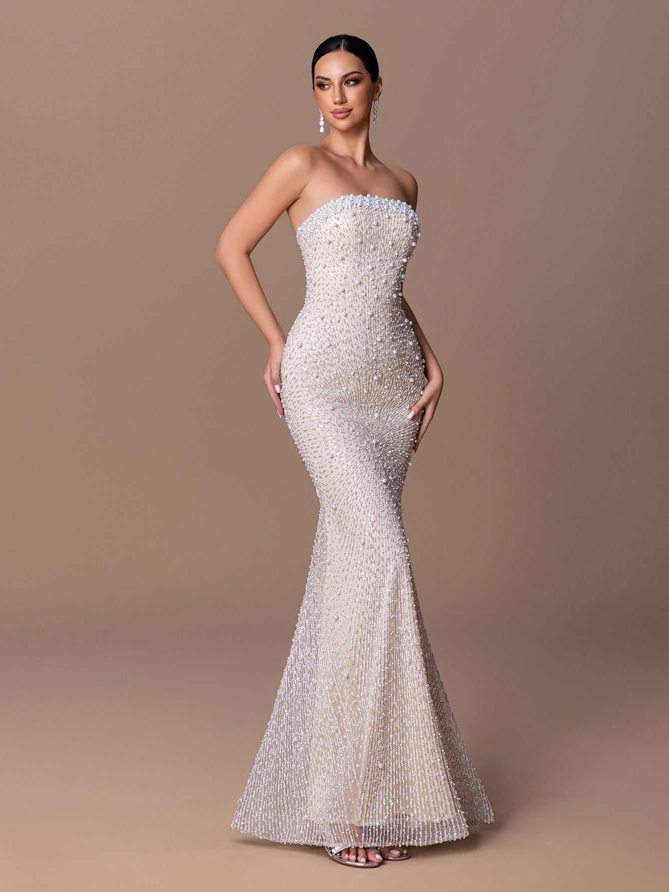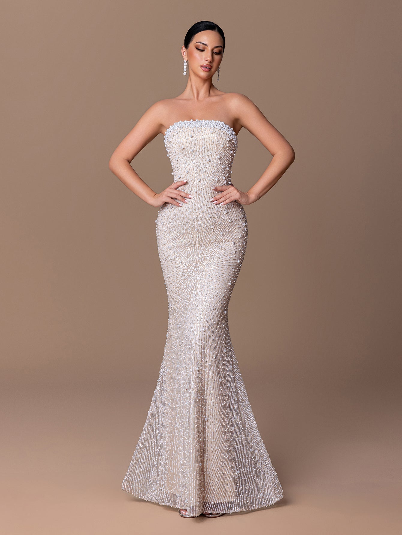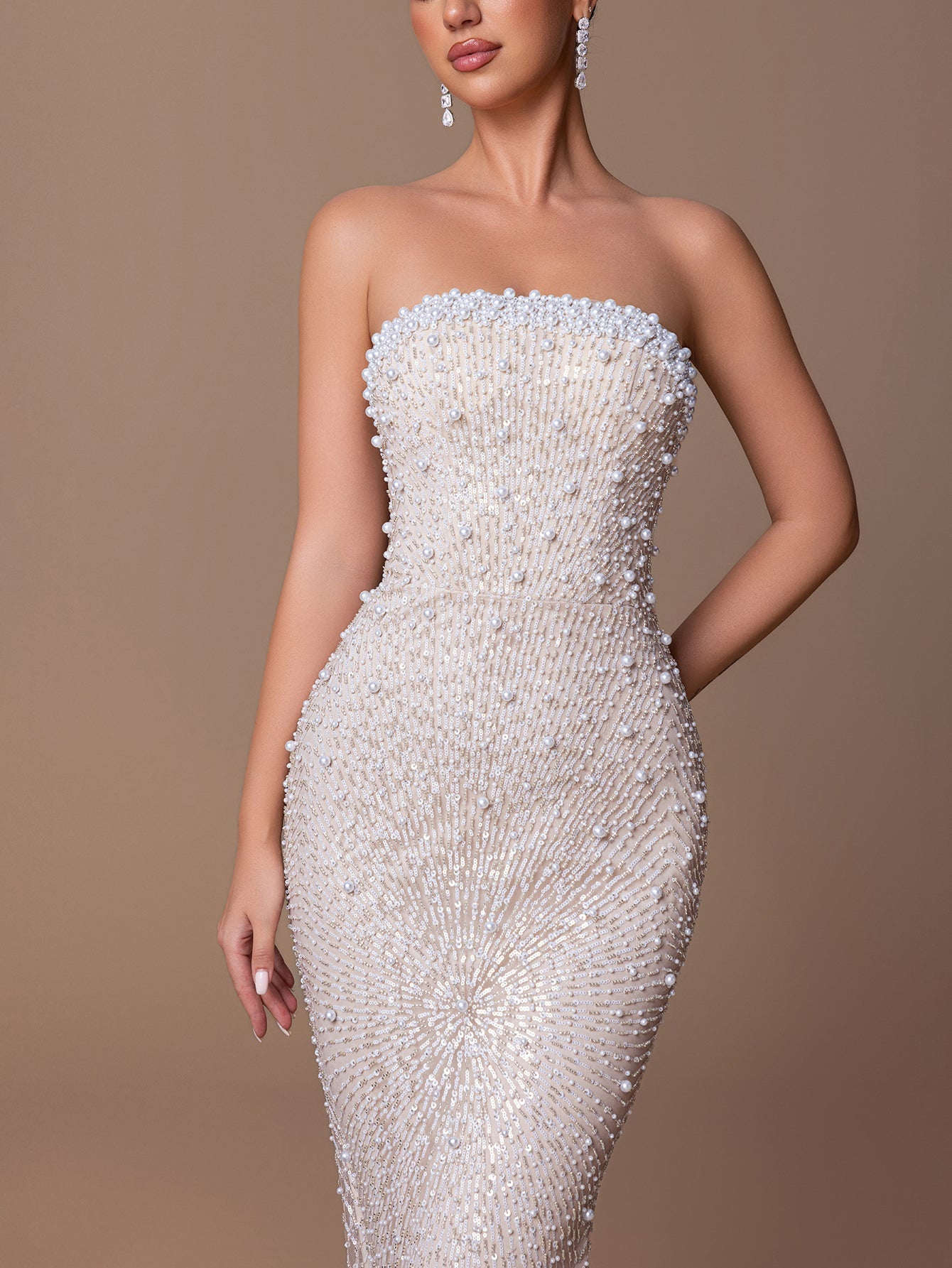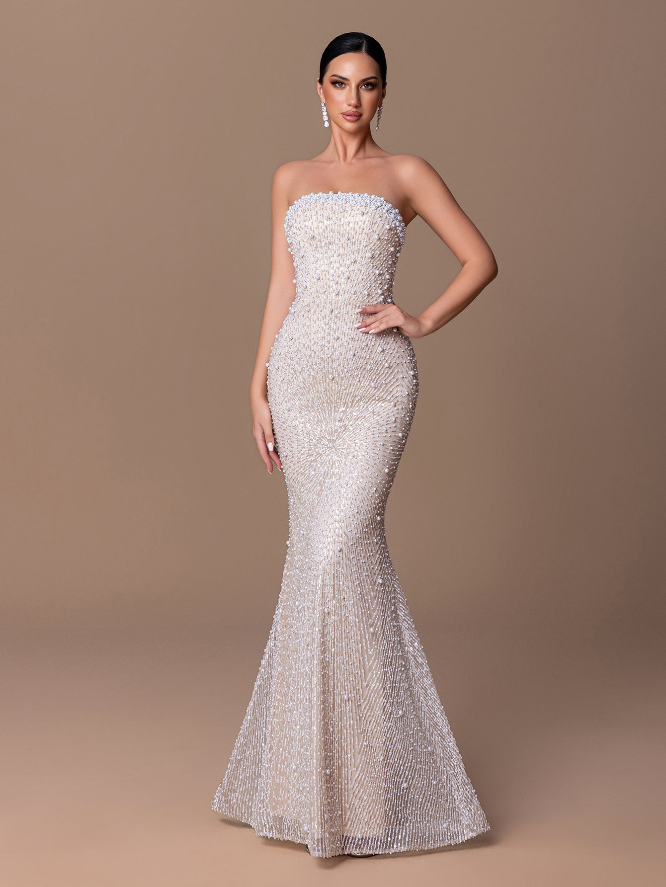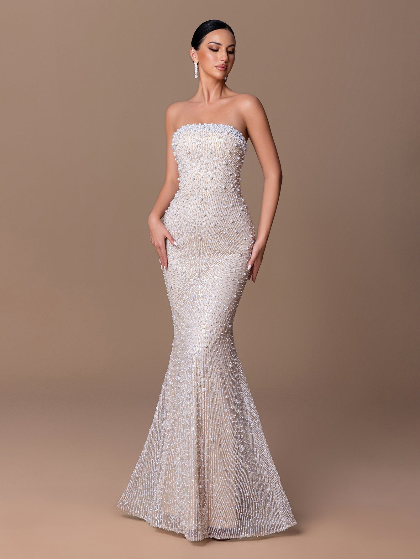 Strapless Mermaid Gown with Beaded Sequins & Crisscross Tie-Back