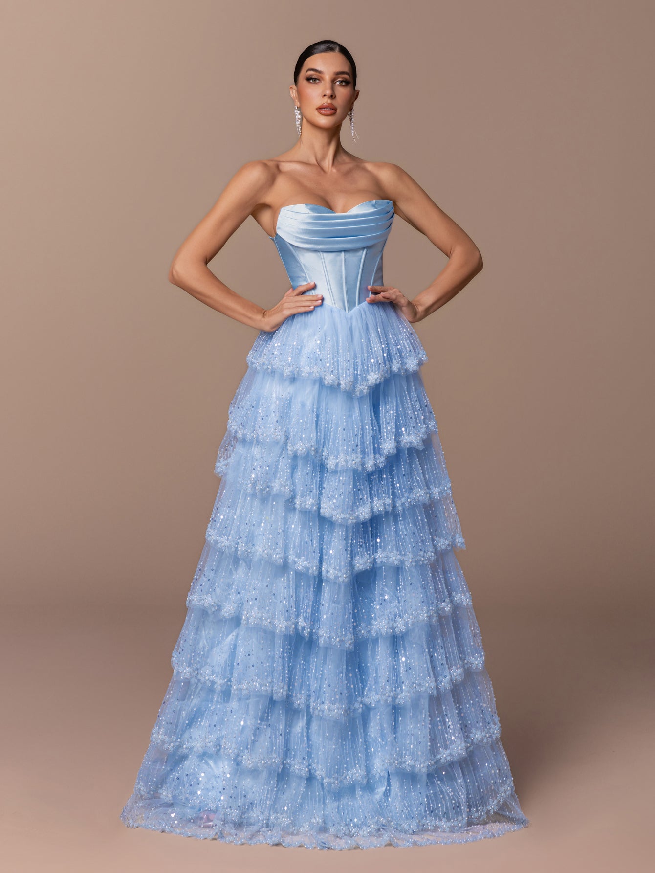 Strapless Satin Gown with Criss Cross Back Ties, Multi-Layered Tulle and Sequins